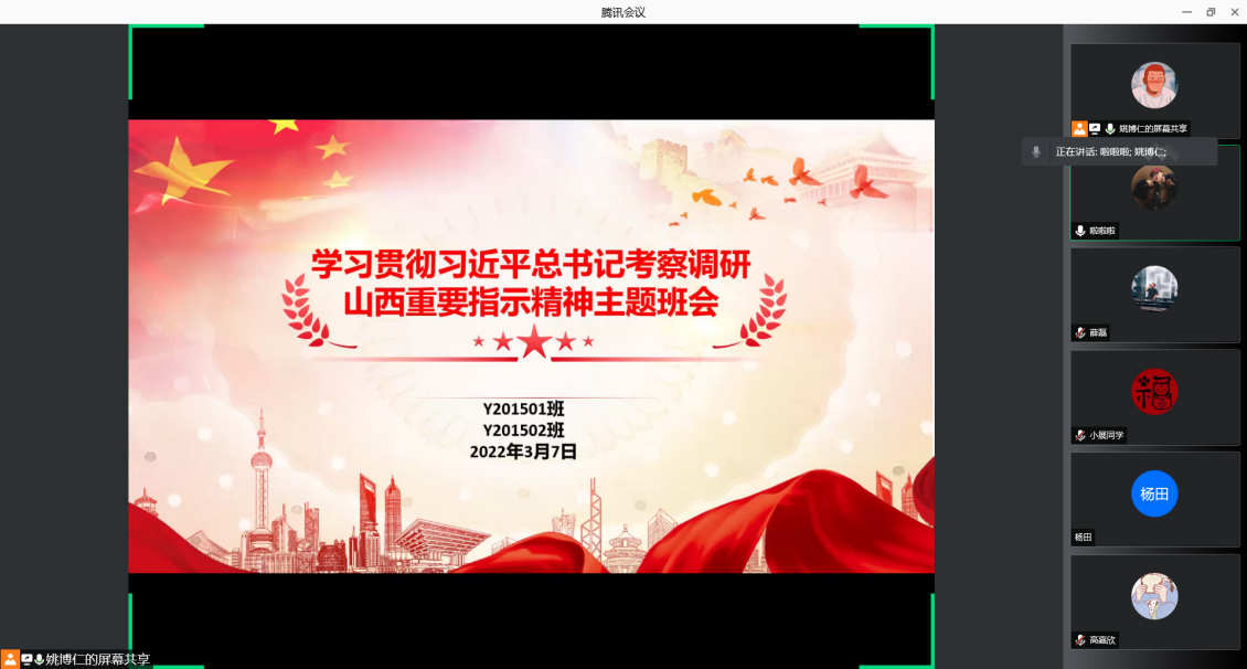 为贯彻学习习近平总书记考察调研山西重要指示精神,充分调动广大学生的积极性和主动性,在2022年3月7日,我院研究生通过腾讯会议的形式召开了“学习贯彻习近平总书记考察调研山西重要指示精神”的主题班会。