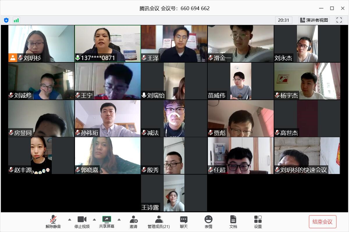 2020年6月1日下午,电气与控制工程学院本科生第一党支部线上开展了理论学习会,学习十九届四中全会会议精神,贯彻习近平总书记视察山西重要讲话暨山西省委书记楼阳生在中北大学调研的重要讲话精神。全体党员参与会议,会议由党支部书记薛艳霞老师主持。