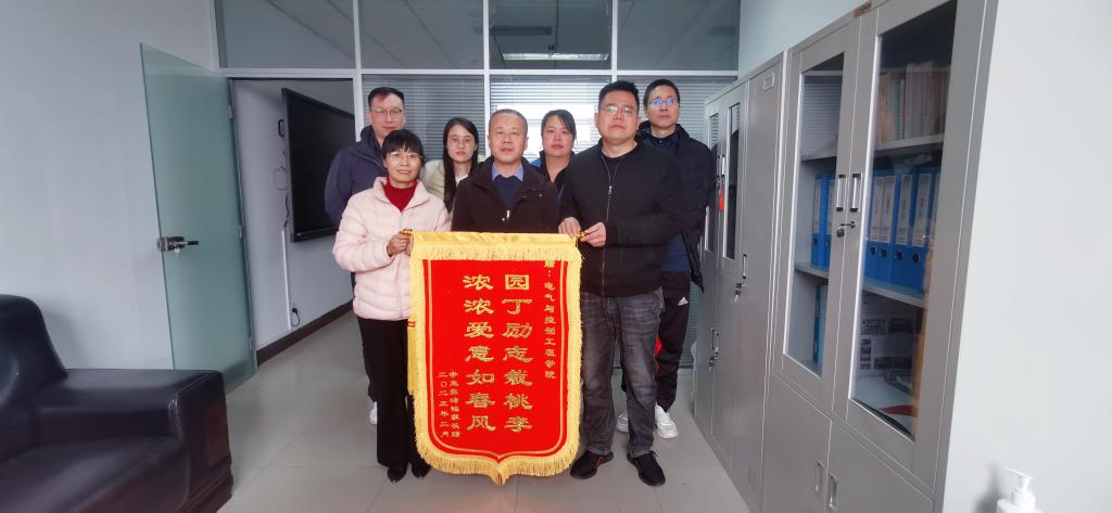 2023年2月23日上午,电气与控制工程学院2021级自动化专业21150141班学生张治铭家长将绣有“园丁励志栽桃李,浓浓爱意如春风”的锦旗送至我院,以此感谢学校和学院在张治铭突发疾病以来对学生的关怀与照顾。