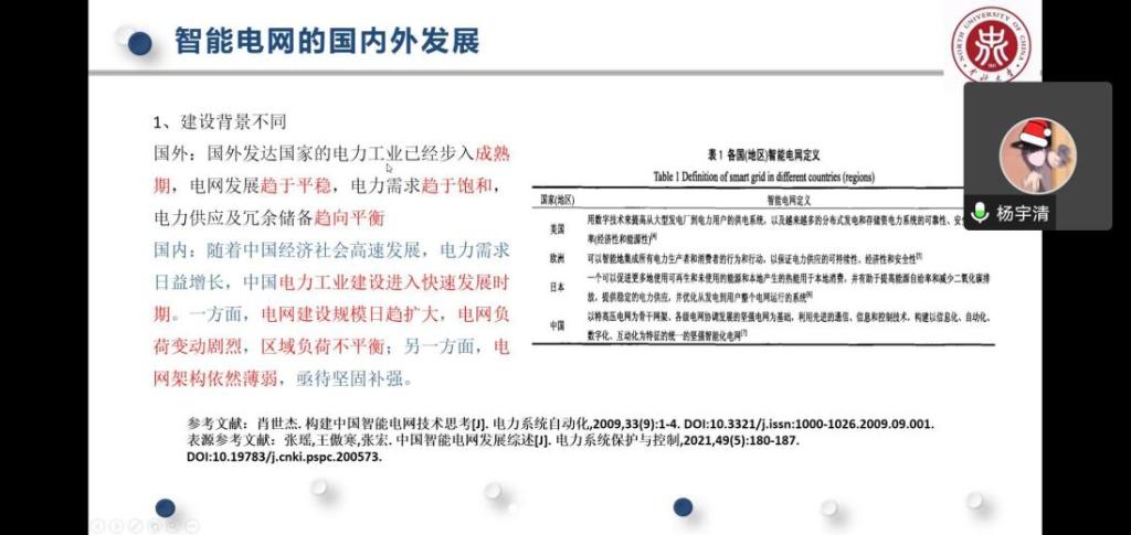 论文小学堂开始,杨宇清同学就智能电网的国内外发展引入,带同学们步入智能电网的大门。借着同学们的好奇和热情,杨宇清同学又带着大家更深入的了解智能电网的亮点,阐述了主动配电网,能源互联网,源网荷储一体化,泛在电力互联网亮点。智能电网的亮点更加燃起同学们的兴趣。乘着兴趣,杨宇清同学又指出智能电网存在的问题与挑战,帮助同学们更全面地了解智能电网。
