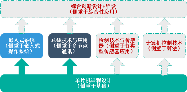 平台目前主要支撑单片机技术基础类实验、嵌入式操作系统类实验、总线类扩展实验,后续如经过持续开发(扩展板开发)还可支撑的实验类型如图3所示。其中,对于单片机应用课程,实验侧重于各基本应用功能的编程与学习,如GPIO功能实验、LED流水灯实验、中断功能实验、AD/DA实验、串口通讯实验等。在此基础上,对于嵌入式系统课程,则侧重于嵌入式操作系统的原理编程与学习;对于检测技术与传感器,通过扩展板实现各类型传感器的应用与学习;对于总线技术与应用,侧重于多节点通讯编程与学习;对于计算机控制技术,则侧重于控制与滤波算法学习与应用。