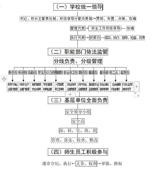1.校党委书记、校长是学校安全工作的第一责任人,担任校安全工作委员会主任,对学校安全生产工作全面负责。其主要职责是:保证党和国家有关安全工作的方针政策、法律法规、决策部署在学校的贯彻执行,提出全校安全工作总体要求;把安全工作列入学校议事日程、纳入校级领导班子成员职责清单、纳入下级党政负责人年度述职和政绩考核的重要内容,督促落实安全工作“一岗双责”制度,推动构建安全工作责任体系;强化安全宣传教育和舆论引导,将安全工作方针政策和法律法规纳入班子成员理论学习内容和各级干部培训内容;坚持安全例会制度,每季度至少召开一次安全例会,统筹协调全校安全工作,及时组织研究解决安全工作的重大问题;加强安全基础建设,严格实行高危项目审批和校园规划、设计、建设、管理等各项工作的重大安全风险“一票否决”,为安全工作提供组织、财力、物力保证;依法领导和组织安全事故应急救援、调查处理及信息公开工作。