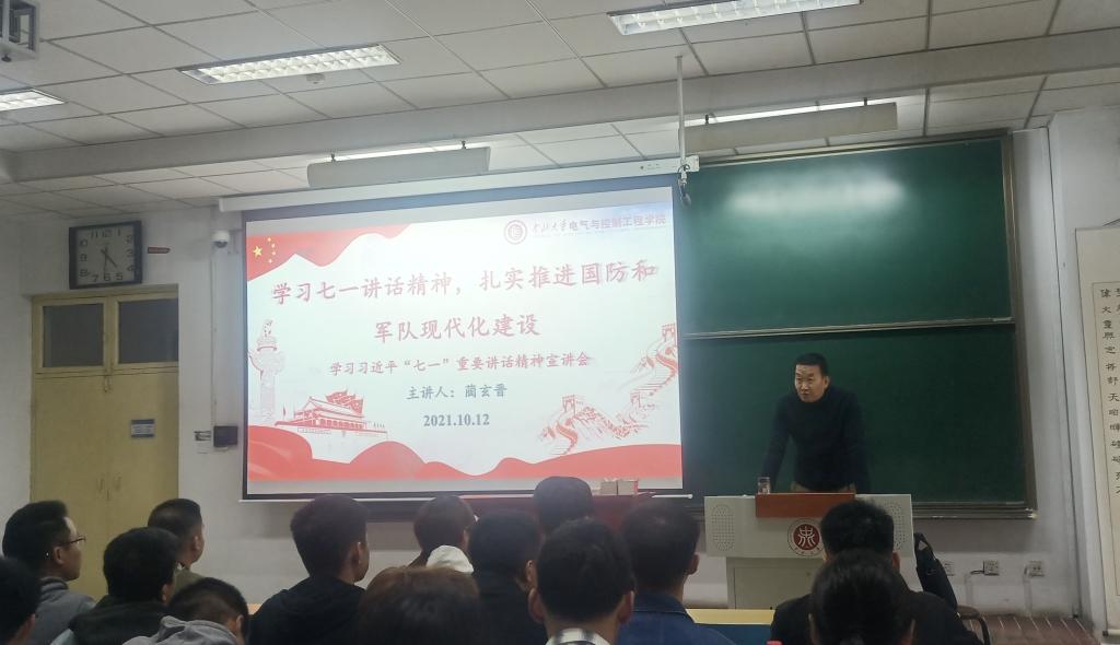 根据中北大学党史学习教育宣讲安排要求,10月12日下午,电气与控制工程学院党委在11512H教室举行了学习贯彻习近平总书记“七一”重要讲话精神专题宣讲会,大会邀请到我校党史学习教育理论宣讲团成员蔺玄晋老师作了题为《学习七一讲话精神,扎实推进国防和军队现代化建设》的专题宣讲。会议由学院党委书记陈晔主持,全院师生党员及入党积极分子参加了会议。