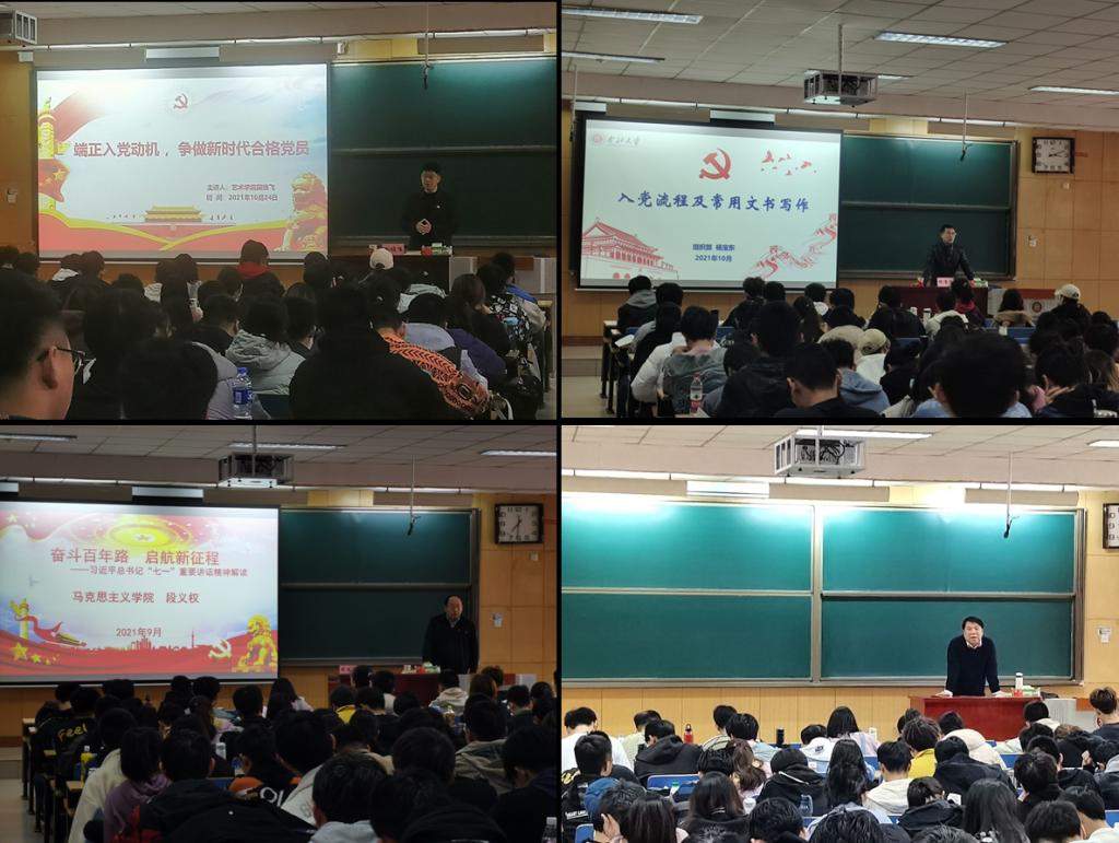 根据培训安排,本次入党积极分子培训班为期两天。马克思主义学院副院长郭玲霞、电气与控制工程学院党委副书记杜苇、艺术学院党委书记栗秀萍、信息与通信工程学院党委书记曹凤才、艺术学院党委副书记田维飞、校党委组织部杨宝东、马克思主义学院党委书记段义权、马克思主义学院阚先学八位教师分别进行了《中国共产党的奋斗历程和优良传统》《强化服务意识,践行党的宗旨》《党的组织原则和纪律》《党的光辉历程》《端正入党动机,争做新时代合格党员》《入党手续及常用文书写作》《奋斗百年路,启航新征程——习近平总书记“七一”重要讲话精神解读》《坚持中国特色社会主义的历史必然性》专题授课。