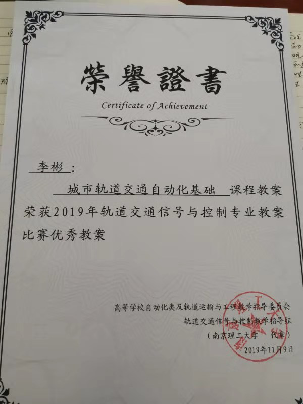 另外,为了推进专业青年教师的教学能力发展,教指委举行了“第一届优秀教案评比”活动,我院轨道交通信号与控制专业的李彬老师获奖。