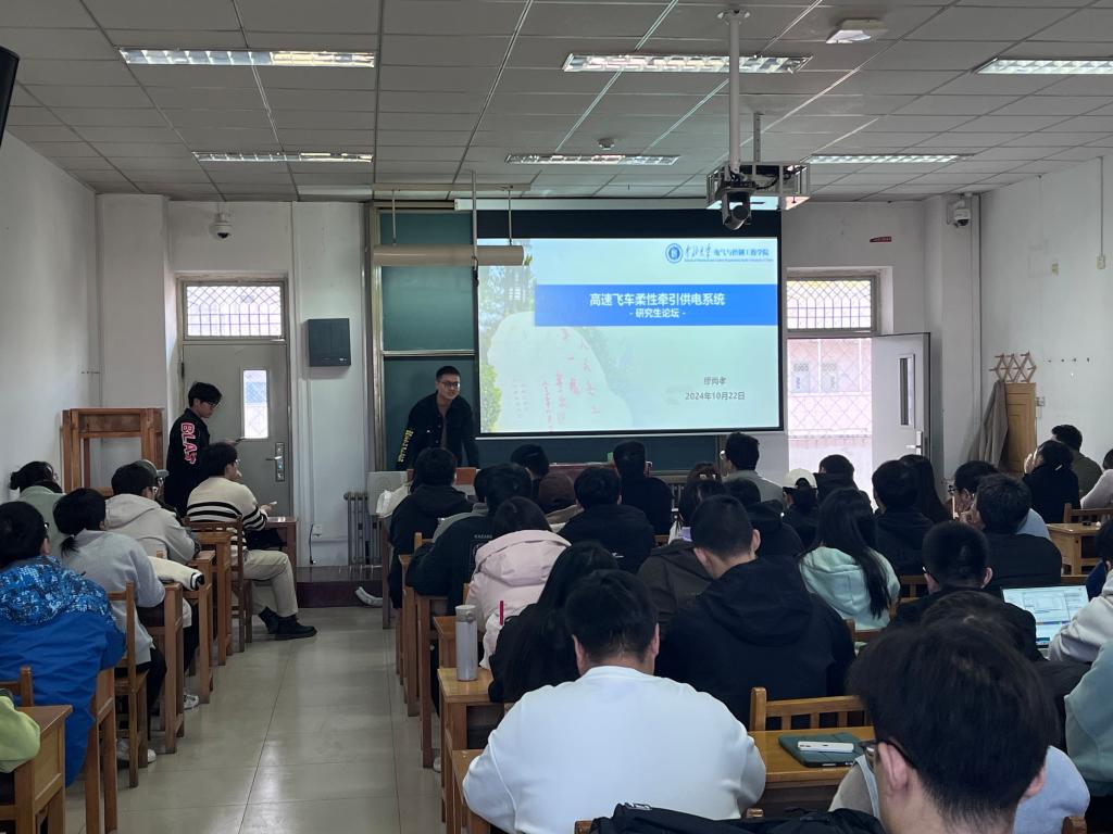 第二位主讲人是缪尚孝,作为国家奖学金获得者,他主要讲解了关于高速飞车柔性牵引供电系统,分别从高速飞车的原理、国外磁浮交通技术发展概况和磁浮交通的牵引供电系统进行了详细的讲解。其次,他也分享了自己研究生期间的学习生活经验,鼓励学弟学妹们珍惜研究生时光,与同学们建立良好的关系,积极参与团队活动,在收获专业知识的同时,学会如何与人相处、如何解决问题、如何承担责任。