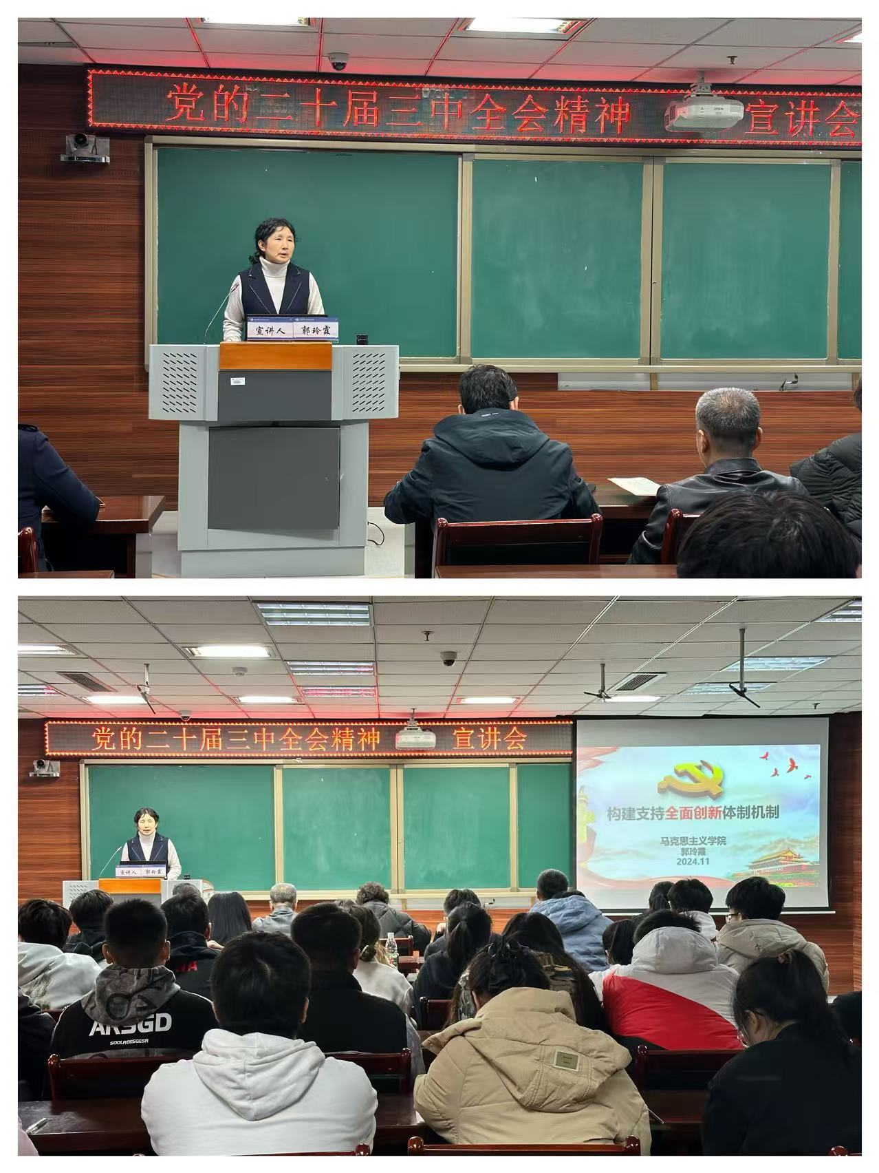 郭玲霞老师围绕党的二十届三中全会中提出的构建支持全面创新的体制机制这一主题,从过去的新成就、现在的新部署以及未来的新任务三个角度进行了深入讲解。在宣讲过程中,郭玲霞老师结合具体案例,深入浅出地分析了构建全面创新体制机制的重要性和紧迫性。她指出,面对当前国际竞争的新态势和国家发展的新需求,我们必须加快改革步伐,推动教育、科技和人才领域的深度融合与协同发展。