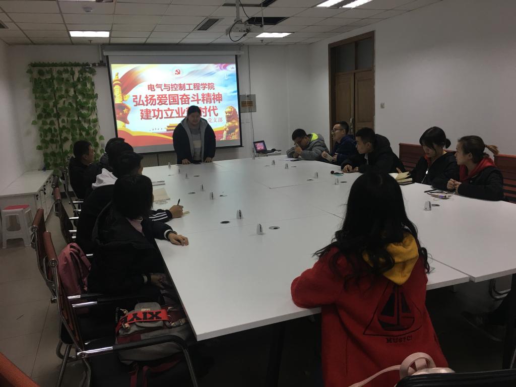 2018年11月16日晚19:00,电气与控制工程学院本科生第一党支部在主楼619组织开展“弘扬爱国奋斗精神,建功立业新时代”主题党日活动。