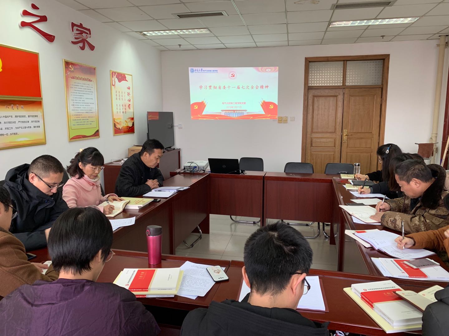 2019年1月11日上午11时,电气与控制工程学院党委组织学习省委十一届七次全会精神,党委委员、党支部书记、科级干部参加会议,会议由院党委书记陈晔主持。