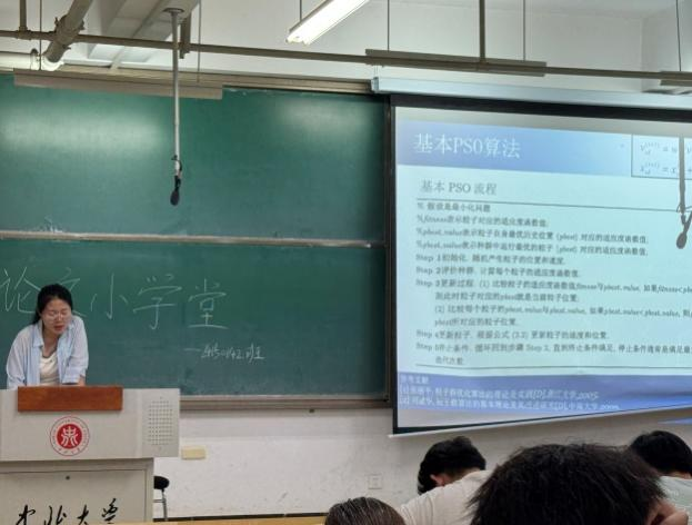 本次学堂开展了对《基于改进粒子群算法的无人机三维路径规划》论文的学习。论文学堂一开始,主讲人用一个在教室里找人的例子来引入PSO算法并对比两种寻找目标人物的方法优劣来帮助同学们理解文章所用改进PSO法和传统PSO的区别。优化后的PSO算法具有以下优点:开始寻找时,“粒子”随机抽签,保证找人“粒子”的随机分布,覆盖更全面的搜索空间;寻找过程前期“粒子”快速移动,大致浏览搜索未覆盖的区域,并记录自己到过的距离目标最近的位置,后期减速,向着当前距离目标最近的“粒子”靠拢,精细寻找附近区域;如果有“粒子”刚开始或者寻找错误被困在比如讲台等区域无法继续寻找目标,“柯西变异扰动”下部分学生随机转向其他区域,避免因为障碍物或者局部误区导致的停滞。这个例子帮助同学们更直观地体会到优化算法的更好的初始策略、动态调整机制及抗扰(抗陷阱)能力。在将同学们代入情境之后,主讲人接着讲解了PSO的数学模型、伪代码、相关应用编程等PSO算法相关理论基础知识。