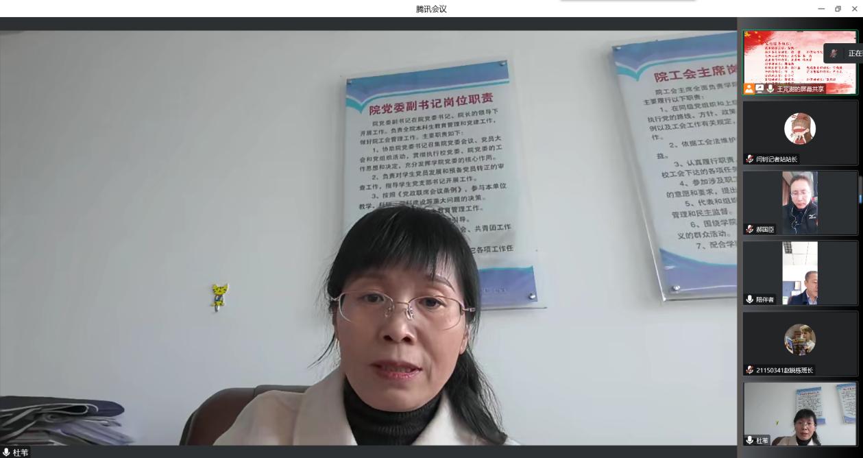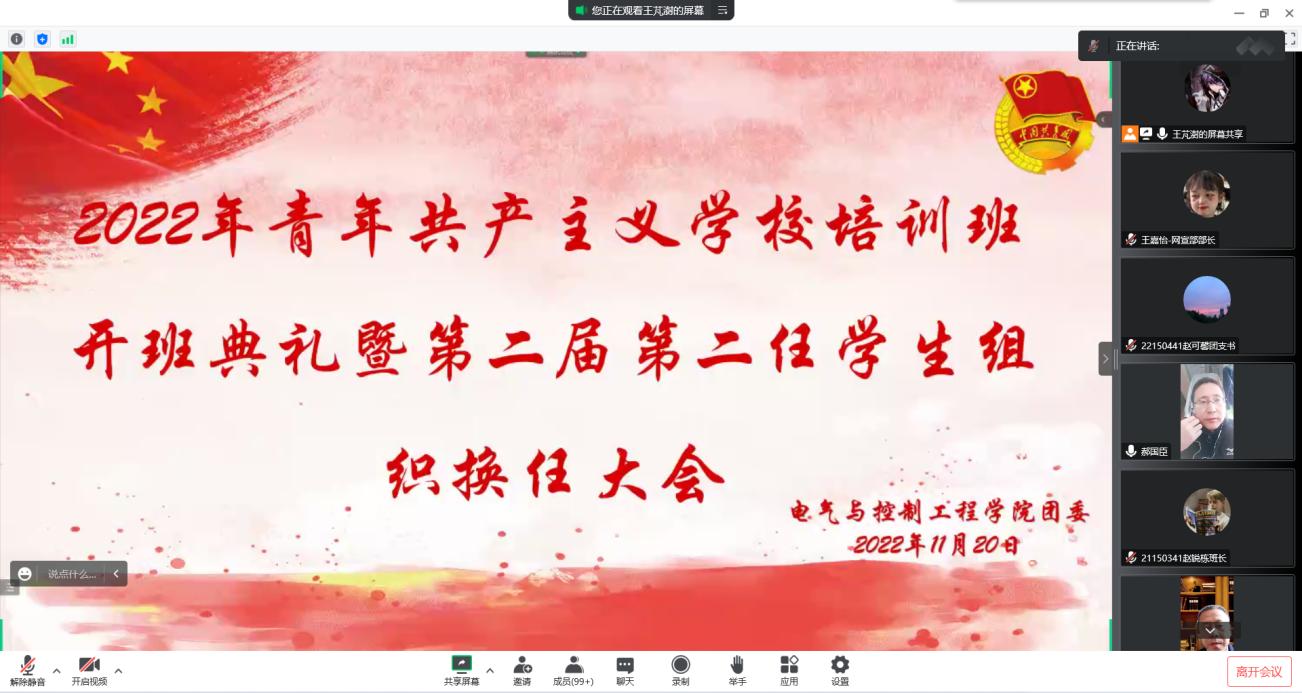 为深入学习宣传贯彻党的二十大精神,持续推进我院“青年马克思主义者培养工程”建设工作,2022年11月20日,电气与控制工程学院在线上召开了青年共产主义学校培训班暨第二届第二任学生组织换任大会。参加开班典礼的有院党委书记赵正杰、院党委副书记兼副院长杜苇、院团委书记郝国臣以及我院全体学生骨干。本次典礼由院团委副书记王芃澍主持。