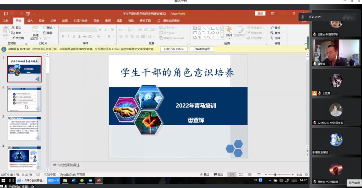 青共校培训环节,第一节课由杜苇老师以《勇担青春使命,争做青年先锋》为题,从学生干部的责任与使命、应具备的素质和能力,引领青年学生坚定不移听党话,跟党走,做有理想、敢担当、能吃苦、肯奋斗的新时代好青年等方面进行讲解。