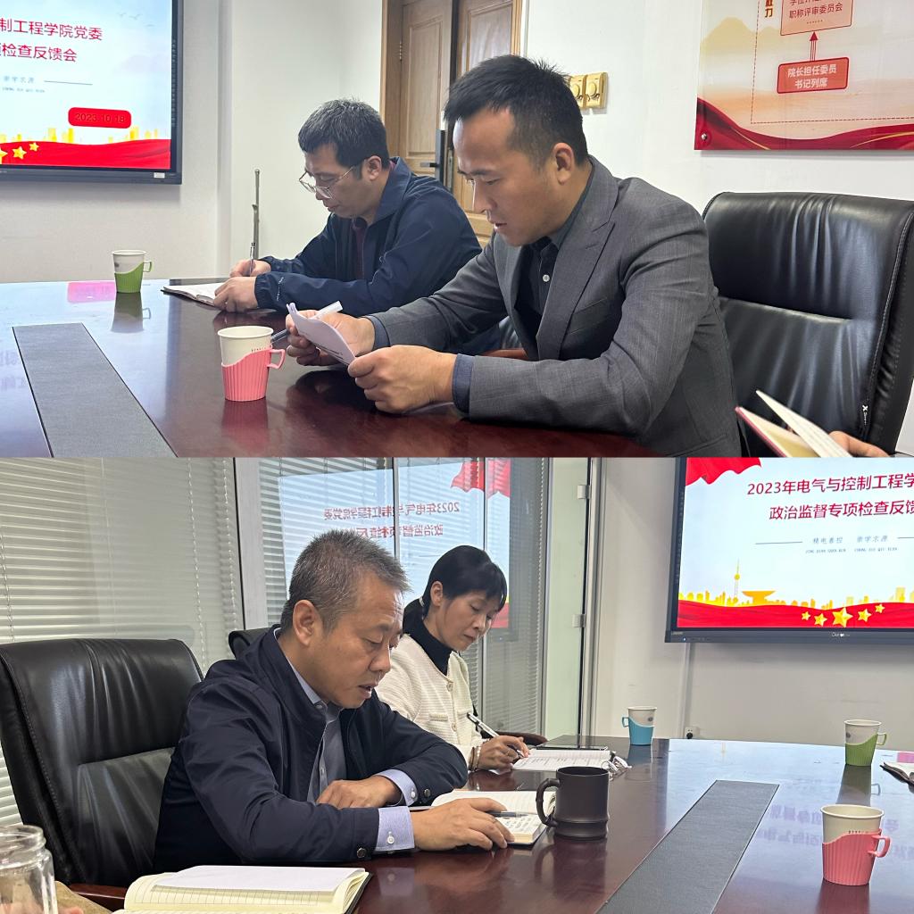2023年10月18日下午,学校政治监督专项检查第一监督检查组莅临电气与控制工程学院召开2023年政治监督专项检查情况反馈会。检查组刘光、霍俊樱出席会议,院党委书记赵正杰、院党委副书记杜苇、副院长任一峰、院党委委员张利平参加了会议。会议由学院党委书记赵正杰主持。