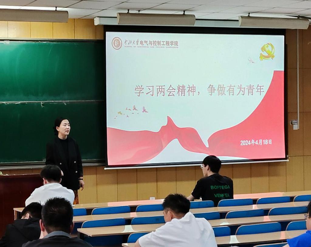 为引导学生深刻领会两会精神实质,增强青年学子的责任感和历史使命感。2024年4月18日下午,电气与控制工程学院召开研究生“学习两会精神,争做有为青年”主题班会,班会由李婷老师主持,研一研二全体研究生参加。