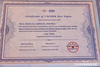2024年11月1日至3日,由中国自动化学会(Chinese Association of Automation,CAA)主办的2024中国自动化大会(China Automation Congress,CAC2024)在青岛召开。我校电气与控制工程学院史元浩副教授指导的2024级硕士研究生李辉论文“State of health estimation of lithium-ion batteries based on TiDE”经大会评审,被评选获2024年中国自动化大会优秀论文奖(“Best Paper Award”)。