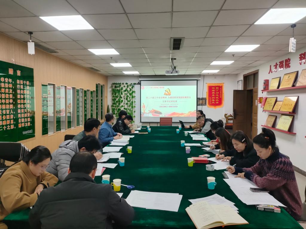 为深入学习领会党的二十届三中全会精神,引导新时代教师党员在谱写中国式现代化建设新篇章中挺膺担当。11月12日下午4点,电气与控制工程学院教职工第一党支部在主楼619召开支部大会,对“党的二十届三中全会精神”进行专题学习研讨。会议由支部书记薛艳霞作主题宣讲,全体支部党员参加会议。