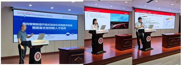 在开班仪式的专题报告环节,华中科技大学黄弢教授带来了《面向智能制造开放自动化实践教学与AI探索》的学术报告,系统且全面地阐述了开放自动化实践教学的创新路径。同时,针对人工智能技术在工业控制领域的融合应用前景,展开了深入而细致的探讨,为听众呈现了一场知识与思维的盛宴。倍福中国数据工程师何丹莉则作了《TwinCAT机器学习与人工智能(AI)》的专题报告,详细剖析了TwinCAT软件在机器学习与 AI 应用方面的功能特性,并结合实际案例,深入讲解了其实践方法,展示了工业 PC 控制与 AI 技术结合的前沿实践。倍福中国教育合作经理钱生作了《Beckhoff 大学合作计划》的报告。他全面阐述了Beckhoff全球大学合作计划的实施情况、完善的资源支持体系以及在华取得的显著发展成果。同时,着重讲解了本次师资培训的课程设计思路与目标,进一步明确了此次培训对于提升高校教师教学能力的重要价值。