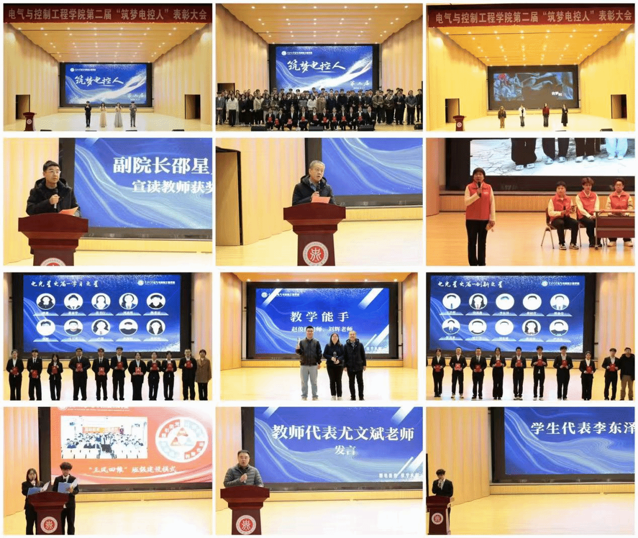 教学副院长邵星灵、院党委副书记兼副院长杜瑞平先后宣读“师者匠心篇”与“电光星火篇”师生获奖名单。表彰了在学院发展中涌现的党建先锋、教学能手、科研标兵、双创达人、文体模范与奉献之星。他们以实干为基、以奋斗为舟、以开拓为刃,凝心聚力,为学院高质量发展贡献了重要智慧与坚实力量。表彰了学生在思想引领、学术探索、科创争先、知行合一、奉献担当五个方面表现突出的先进个人与集体,生动展现了电控学子全面发展的精神风貌,充分发挥了榜样群体的示范引领作用。