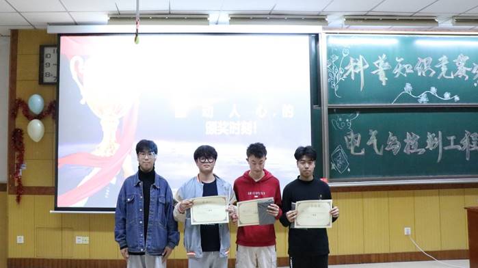 为了增加同学们的科学知识,提高同学们的科学素养和创新能力,并形成爱科学、学科学、讲科学、用科学的新风尚。2020年11月1日19:00,中北大学电气与控制工程学院于9号教学楼302教室举办了以“用音乐歌唱青春,用科技创造生活”为主题的科普知识竞赛决赛。出席本次决赛的嘉宾包括中北大学学生科学技术协会主席吴子迪、中北大学学生科学技术协会团支书迪帅、电气与控制工程学院分科协主席王子恒等其他学院分科协主席。