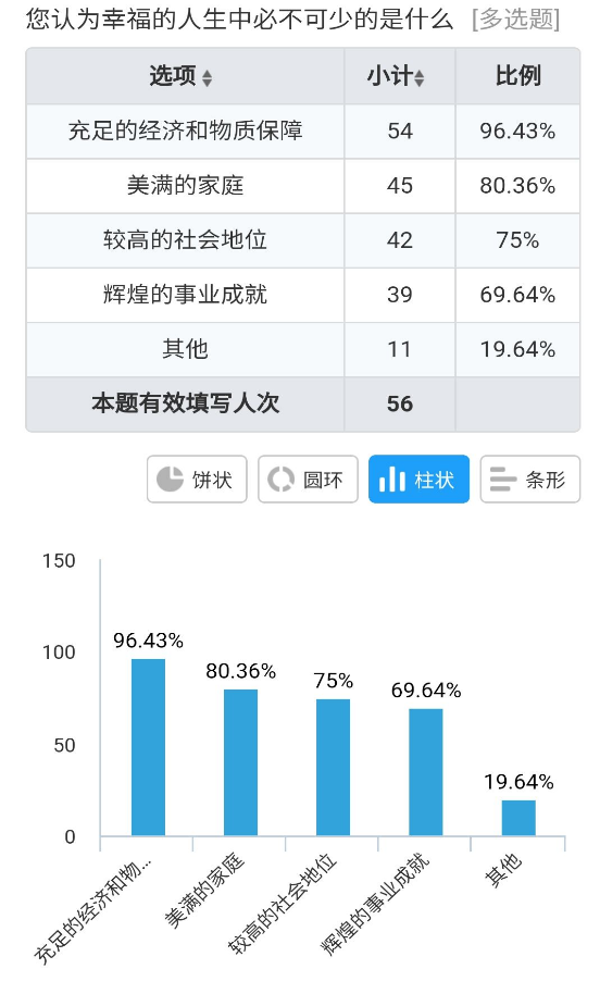 在“你认为幸福的人生中必不可少的是什么”这一问题的调查上,取回的问卷中占比例最高的的是充足的经济和物质保障,高达96.43%;其次是美满的家庭80.36%;第三是较高的社会地位75%;第四是辉煌的事业成就69.64%;