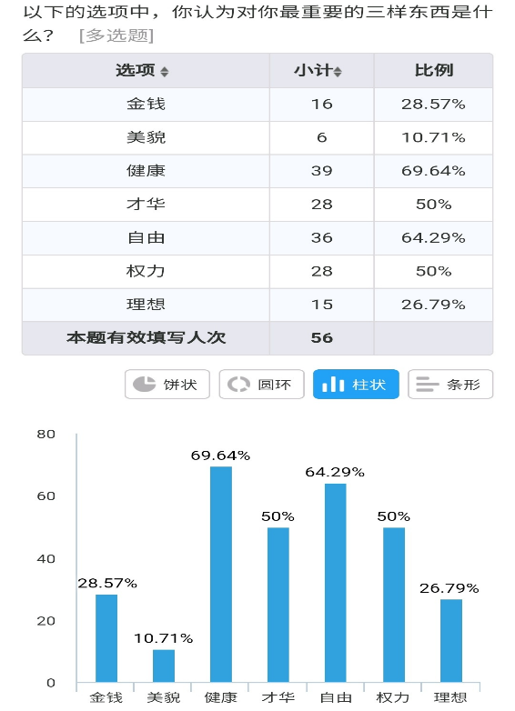 在“你认为对你最重要的三样东西是什么”取回的调查问卷中,大多数人认为健康,自由,才华,和权力是最不可或缺的,其中健康占比最高,为69.64%;第二是自由,自由占到64.29%;