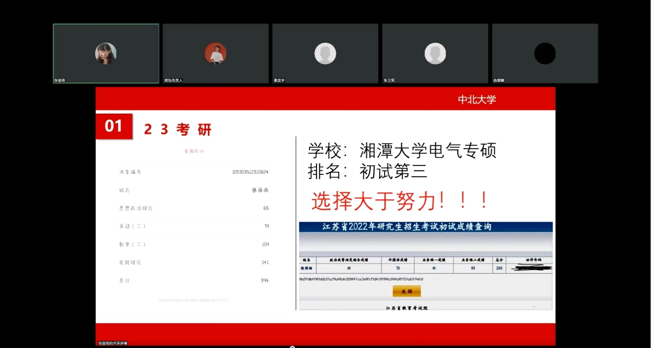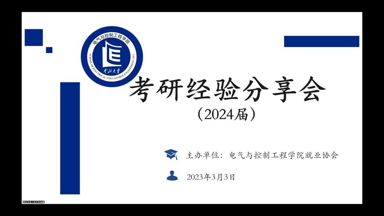 2023年3月3日19:00,电气与控制工程学院采用视频会议方式召开了2024届考研升学指导会。院党委副书记兼副院长杜苇、团委书记郝国臣、20级班主任张栋老师以及20级准备考研的同学参加了本次会议。会议邀请了四位考研成功的优秀校友主讲。