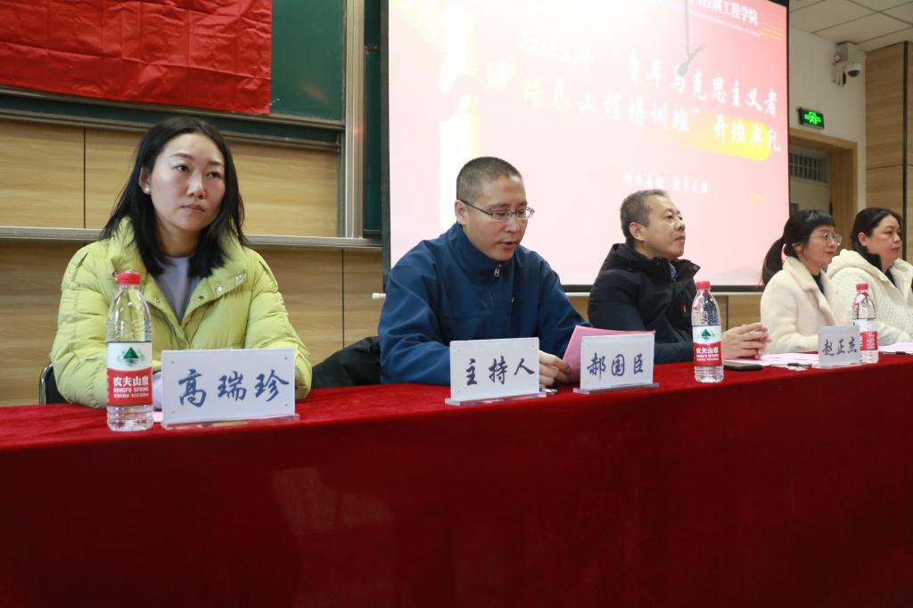 为进一步加强对学生骨干的教育培养,提高其自身政治思想素质和工作能力,坚定政治信念、厚植家国情怀、涵养进取品格,帮助其学习、领会和贯彻党的二十大精神。电气与控制工程学院于2023年12月9日在09201教室召开“青年马克思主义者培养工程”培训。参加开班典礼的有院党委书记赵正杰、院党委副书记兼杜苇、院学生科科长薛艳霞、院团委副书记高瑞珍、学生辅导员屈增以及我院全体学生骨干,本次开班典礼由院团委书记郝国臣主持。