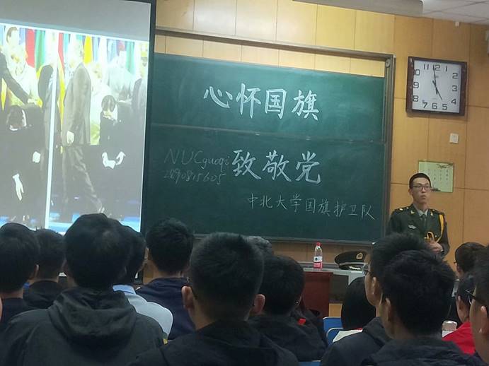 开场,主持人介绍到了场嘉宾,宣布爱国主义国旗法宣讲活动正式开始。国旗护卫队出旗、展旗,全体与会成员起立唱国歌。首先,由国旗护卫队大队长李峰同志向同学们介绍中北大学国旗护卫队这一光荣组织。随后17150342团支部书记庞琳杰向同学们深刻的介绍了国旗的历史、构成以及国旗法。国旗是国家的象征,当代青年要有深厚的爱国主义精神,热爱国旗,走近国旗,让鲜艳的五星红旗永远飘扬在我们的心中!