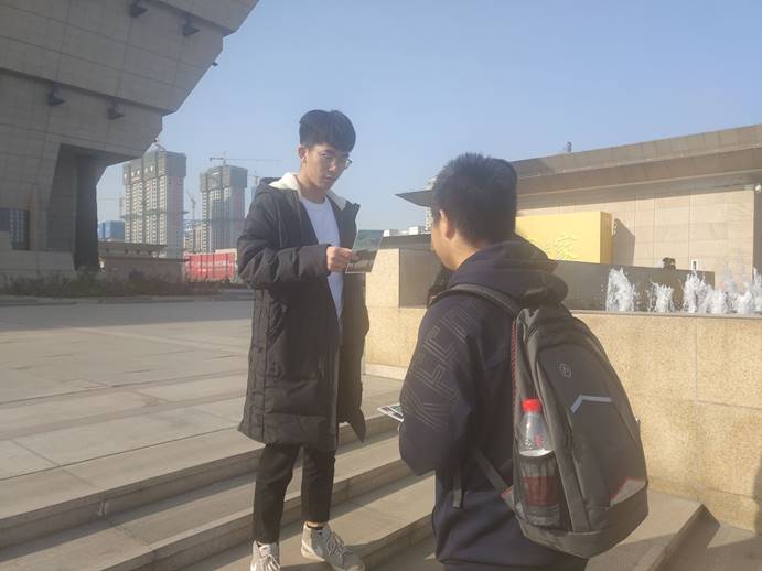 18150343班的青年在土木华章中流连,在佛风遗韵中喟叹,一行秉持文明参观的原则,弘扬着中北学子的青年风采,举止有度。在参观之余,18150343班随机采访了一些路人,向他们进行了党史小知识方面的提问,同学们和他们热切交流,由衷的体味到中共的贡献,中国共产党在革命、建设、改革的伟大实践中谱写的中华民族自强不息、顽强奋进的壮丽史诗。采访结束后,18150343班向其分发了精心准备的小礼品(笔记本,纪念币)。在参观过程中,中北大学18150343班偶遇了太原师范学院的大一新生,同学们向其进行自我介绍,并表明此次活动的初衷并向他们介绍了我们中北大学的光荣历史与薪火传承,最后18150343班分发具有纪念意义的校景明信片。