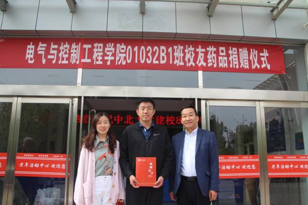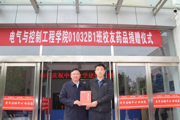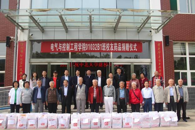 2021年5月16日下午,中北大学建校80周年华诞之际,电气与控制工程学院01032B1班校友为母校捐赠7类疏肝理气保健药品。捐赠药品仪式在老干部处举行。01032B1班校友代表史为兴、副校长赵贵哲、山西校友会会长杨波、校友办主任张胜利、离退休人员管理处处长刘彬、电气与控制工程学院党委书记陈晔参会,应邀参加的还有山西校友会副会长杨斌、副会长曹永勤、离退休人员管理处副处长丁爱玲、副处长王海林、部分离退休干部及01032B1班主任岳凤英。老干部处处长刘彬主持并代表离退休老干部接受捐赠。